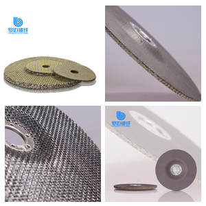 “羅邊玻璃纖維增強砂輪網片 是采用玻璃纖維增強網布涂以酚醛、環氧改性樹脂,經烘培后沖切而成,裁切采用外徑、內孔一次沖切成形工藝。因此,網片具有尺寸公差小,同心度好,周邊光潔等優點。該產品主要為不織布復合網片、黒紙復合網片和純網片,具有極好的耐熱性、高速切割性能及高結構強度。“
